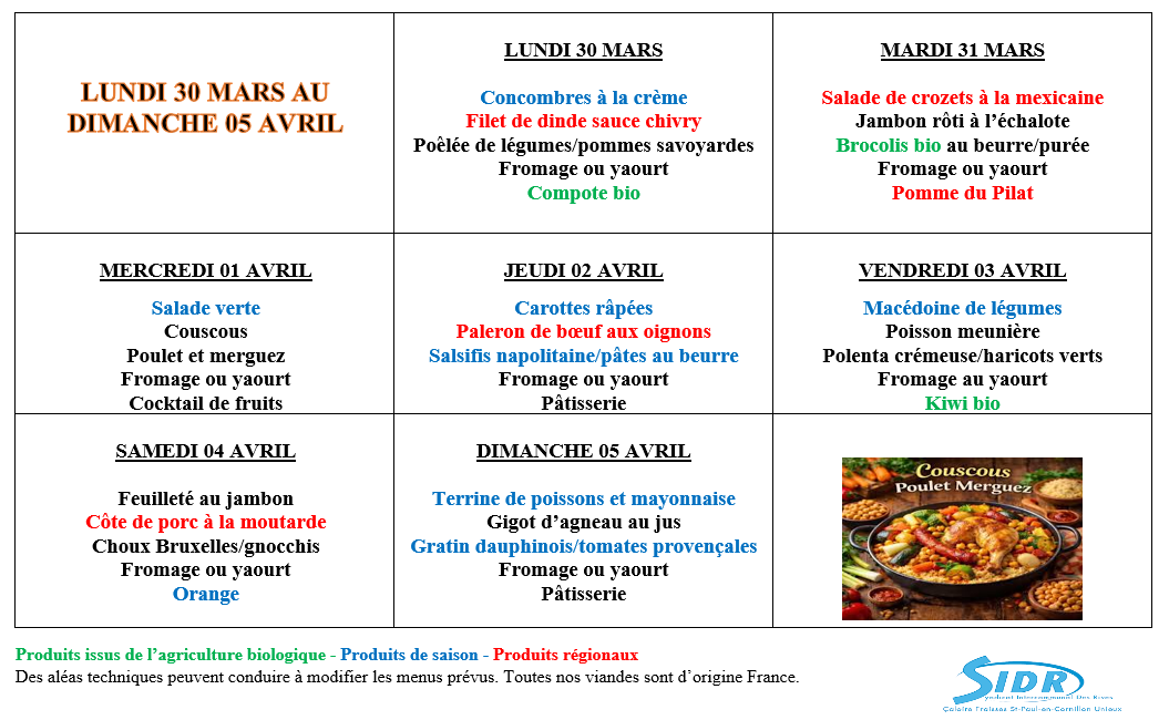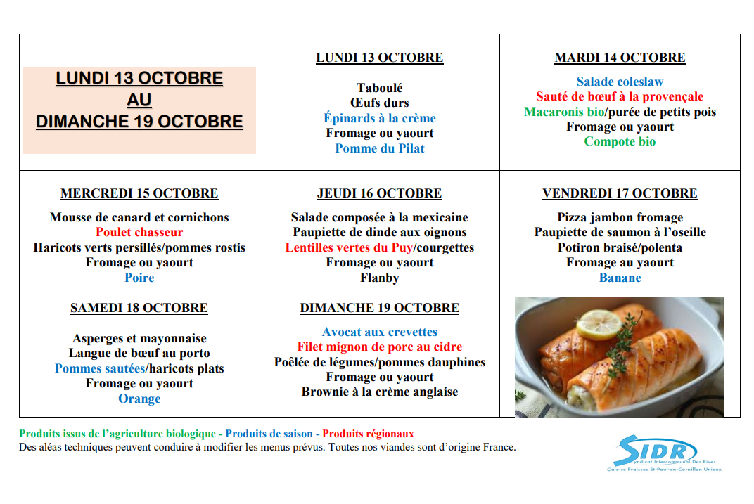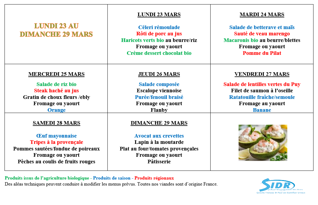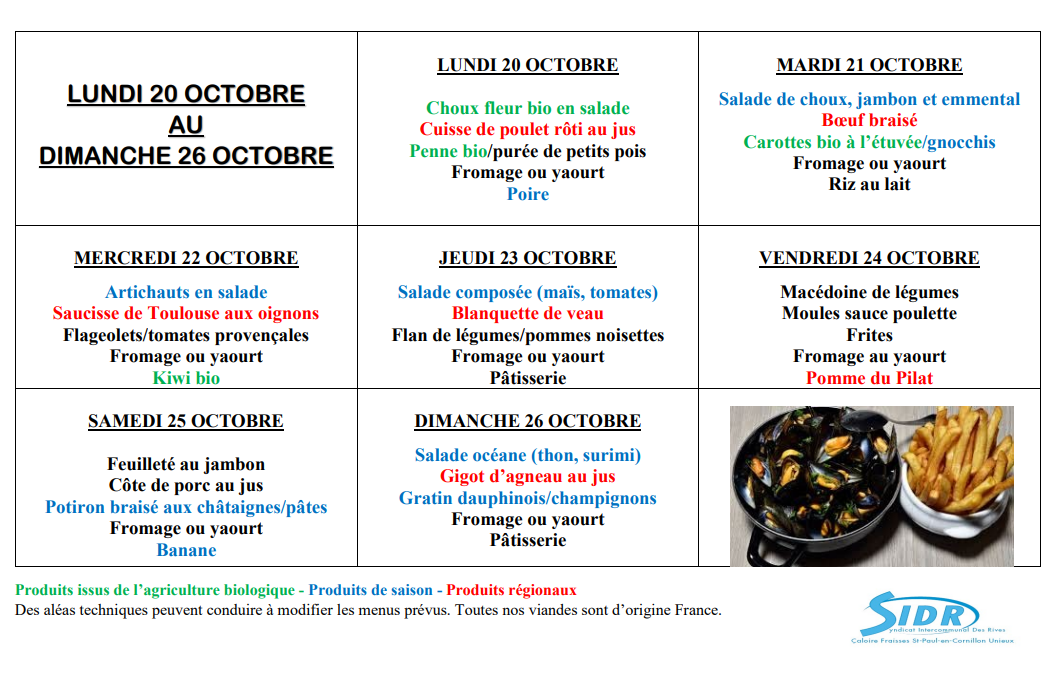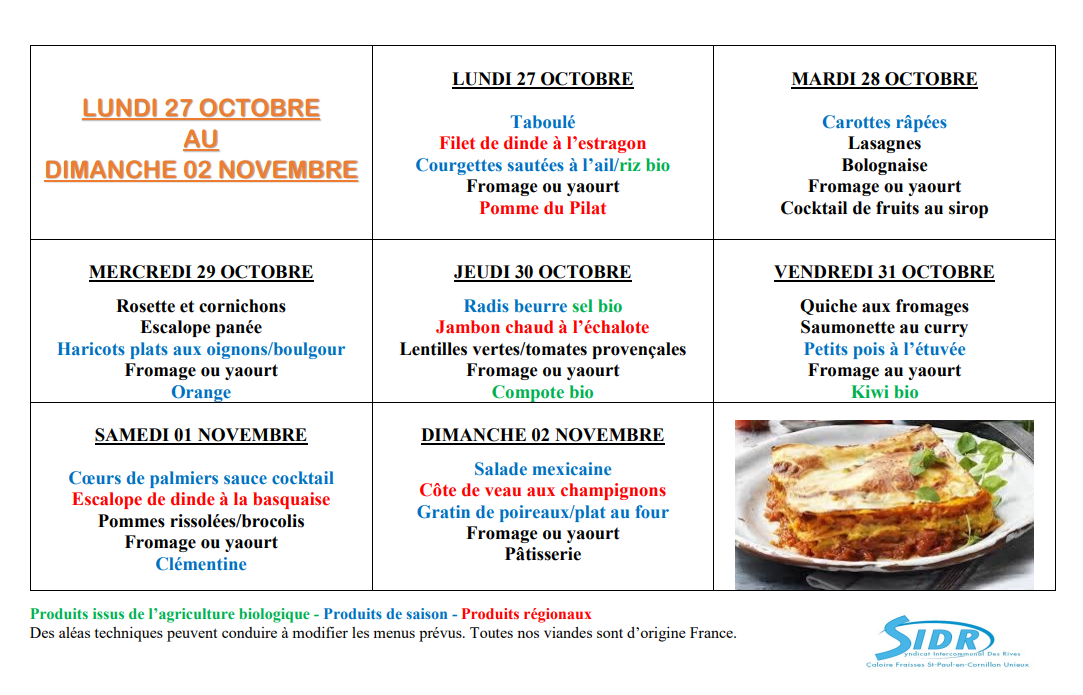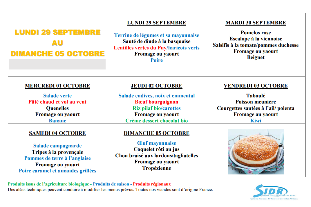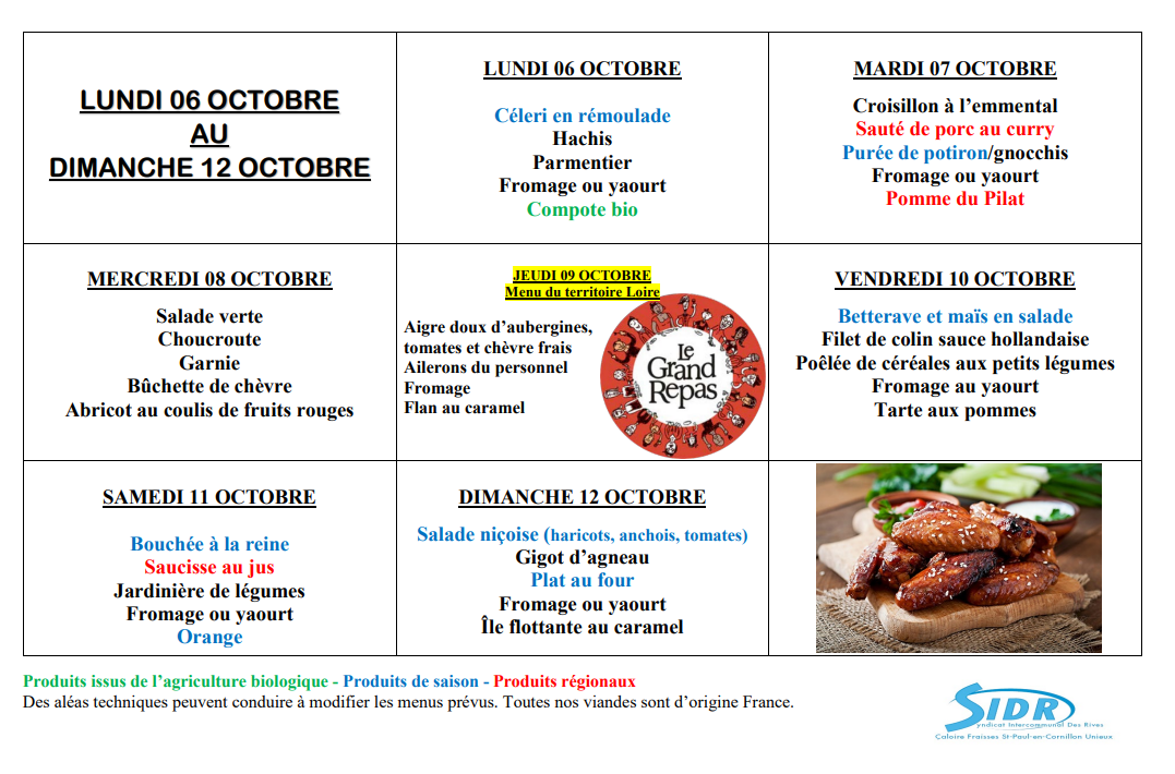 Pour tout renseignement supplémentaire, merci de prendre contact avec le SIDR : Pôle de Services – 12, rue Étienne Visseyrat – 42240 Unieux Tél. 04 77 40 29 60 cuisine.centrale@sidr42.fr www.sidr42.fr Horaires d’ouverture du Pôle de Services : Du lundi au vendredi, de 8h30 à 12h et de 13h30 à 17h